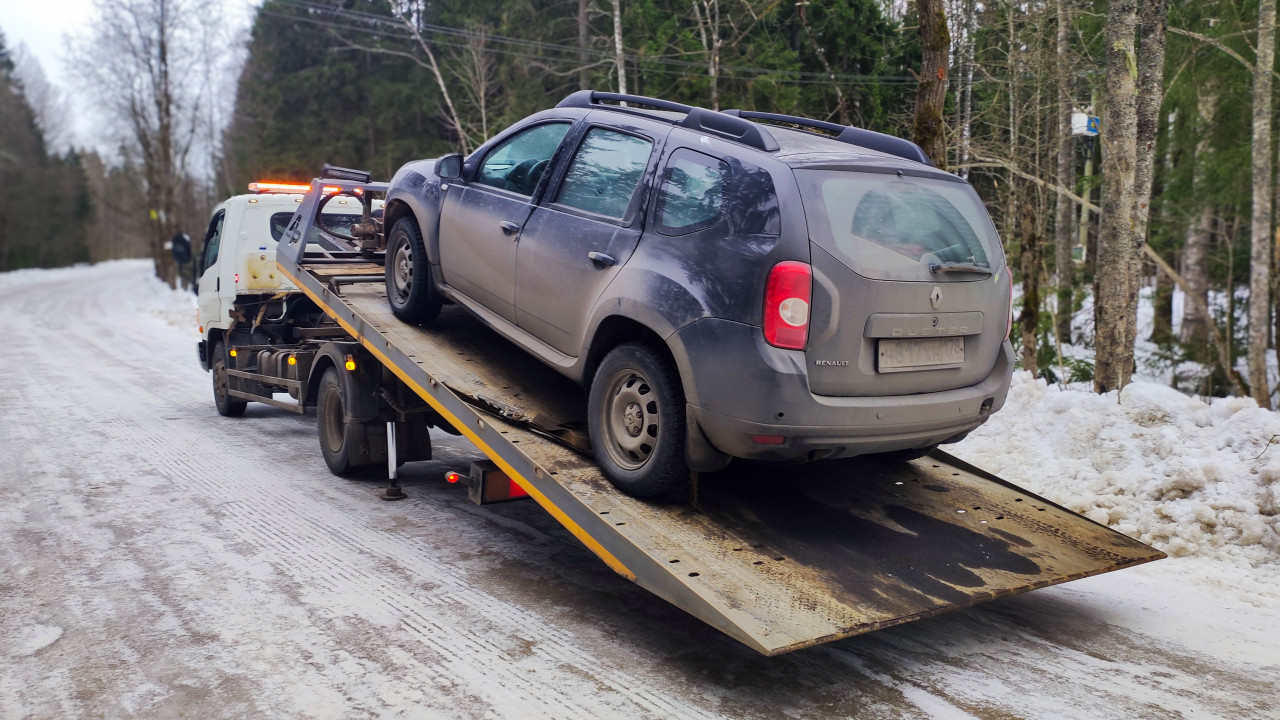 Зимняя эвакуация автомобиля Renault Duster на обледенелой трассе