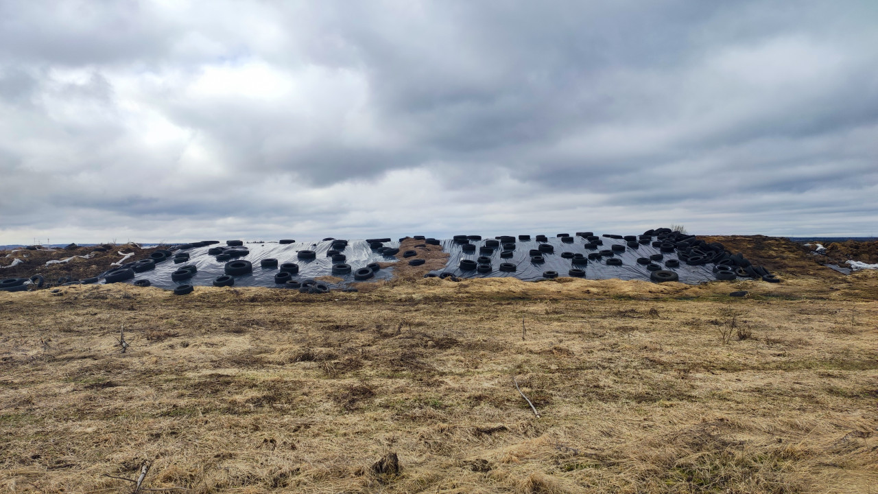 Силосная яма на поле, укрытая чёрной плёнкой и шинами
