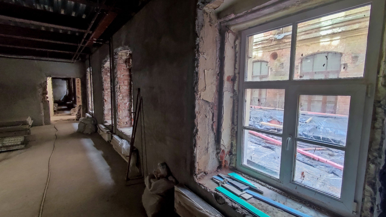 На фотографии показано помещение старого здания в процессе реконструкции. В кадре — частично оштукатуренные стены, металлические балки перекрытия и новое пластиковое окно, через которое виден внешний фасад исторического кирпичного строения XIX–XX века. Снаружи проходят коммуникации, укрытые плёнкой. Внутри помещения — строительные материалы и следы штукатурных работ. Сцена отражает процесс реставрации архитектурного объекта с сохранением оригинальной кирпичной кладки.