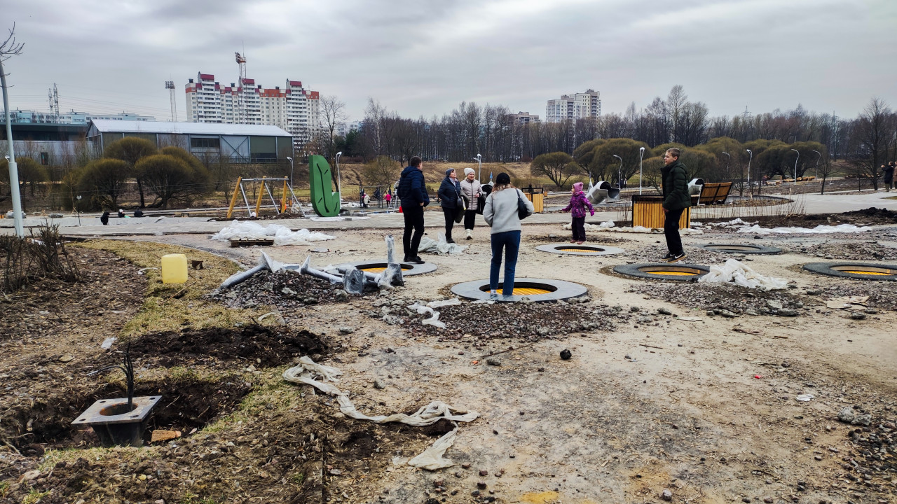 На фото запечатлён участок новой площадки с установленными элементами благоустройства. В центре видны круглые конструкции, вероятно, основания для тренажёров или игровых элементов, а также несколько человек, осматривающих территорию. На заднем плане — деревья, освещение, скамейки и жилые дома. Сцена отражает процесс завершения городских строительных работ. Фотография подходит для материалов о реконструкции, урбанистике и развитии общественных пространств.