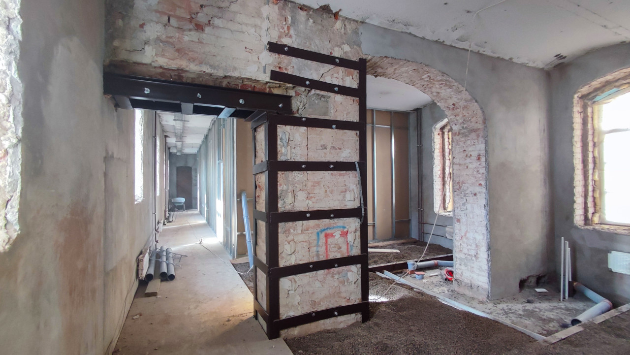 На фото показан кирпичный простенок с металлическим усилением, закреплённым болтами. Видны арочные проёмы и штукатурка стен, характерные для старинных промышленных зданий конца XIX – начала XX века. Сцена отражает этап реставрации, когда старую кладку усиливают для предотвращения разрушений. Изображение подходит для материалов о сохранении архитектурного наследия и инженерной реконструкции.
