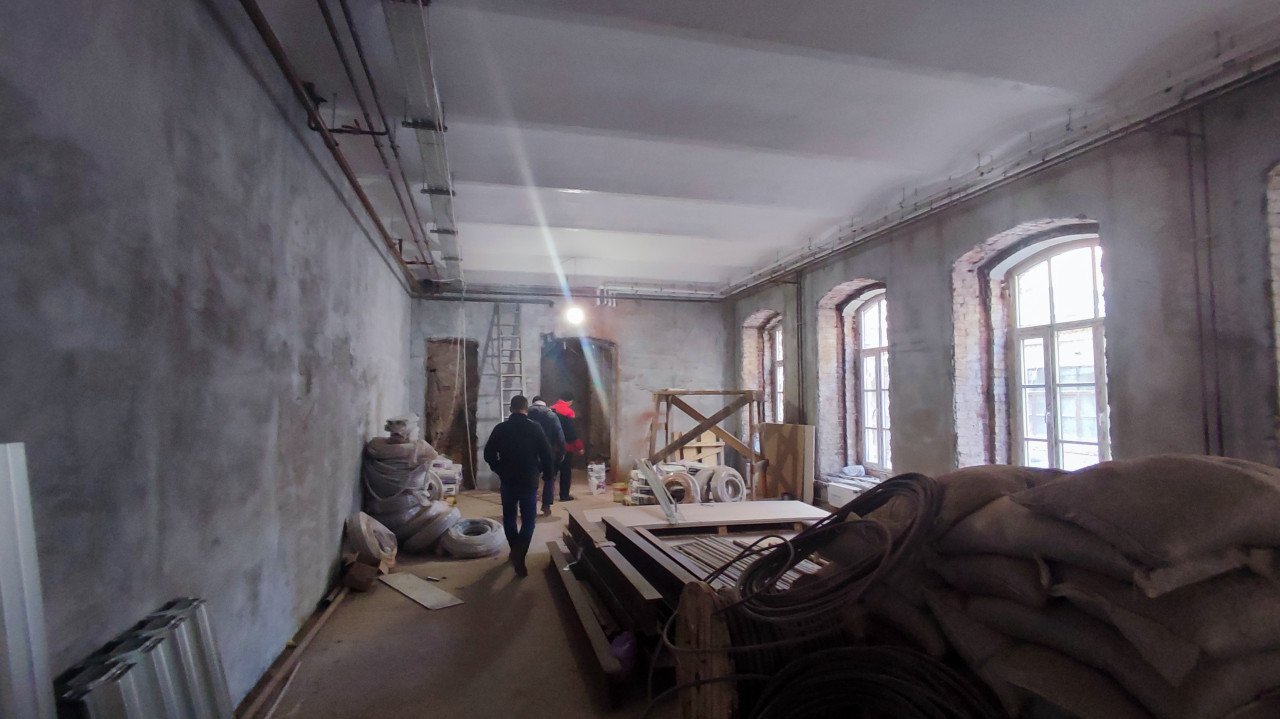 На фотографии изображён длинный коридор исторического здания, где ведутся реставрационные работы. Стены очищены до кирпичной кладки, вдоль потолка проложены новые инженерные коммуникации. В кадре видны строительные материалы, мешки и рабочие, осматривающие помещение. Сцена отражает процесс реконструкции старинного здания, построенного в XIX–начале XX века, и подходит для публикаций о сохранении архитектурного наследия и восстановлении инженерных сетей.