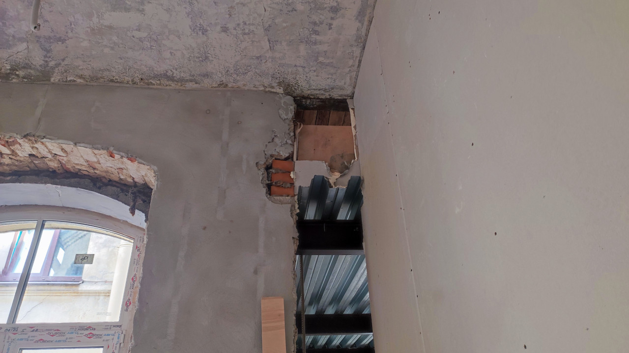 На изображении виден участок стены с обнажённой кирпичной кладкой и частично разрушенной штукатуркой. В проёме установлено металлическое перекрытие и профилированный настил. Сцена характерна для капитального ремонта исторических зданий с сохранением оригинальных конструкций. Фото может быть использовано в статьях о строительных дефектах, ремонте и реконструкции фасадов.
