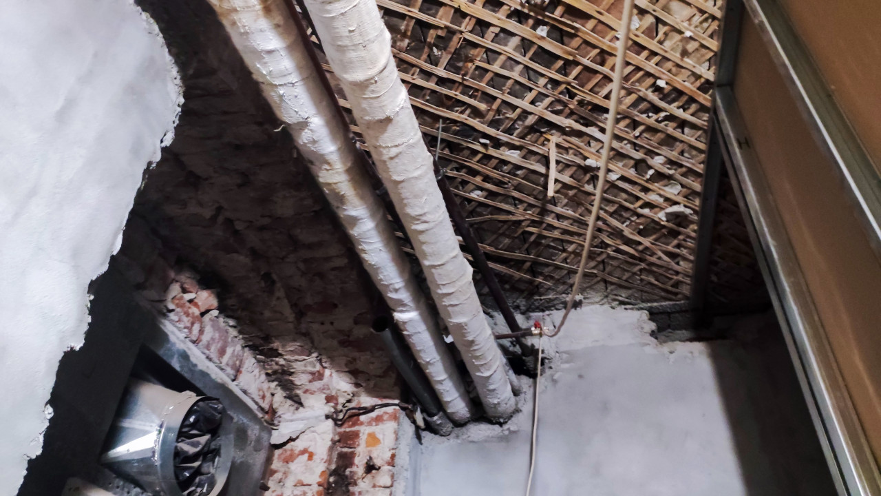 Фотография показывает утеплённые трубы, проложенные вдоль кирпичной стены под старым потолком, выполненным из деревянной дранки. Видна металлическая вентиляционная труба и участки цементной штукатурки, свидетельствующие о ходе ремонтных работ. Помещение относится к категории технических, вероятно, в здании XIX–XX века. Кадр отражает сочетание старой архитектуры и современных инженерных решений при реконструкции промышленных объектов и котельных.