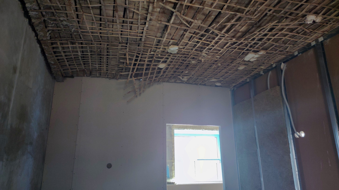 На фотографии показано помещение в процессе реконструкции старого здания. Потолок выполнен из деревянной дранки с частично осыпавшейся штукатуркой, а на стенах установлены листы гипсокартона. Виден оконный проём с новым утеплением и частичной герметизацией. Фото отражает этап реставрации архитектурного объекта XIX–XX веков, характерного для промышленной застройки, и может использоваться в материалах о строительстве и реконструкции.