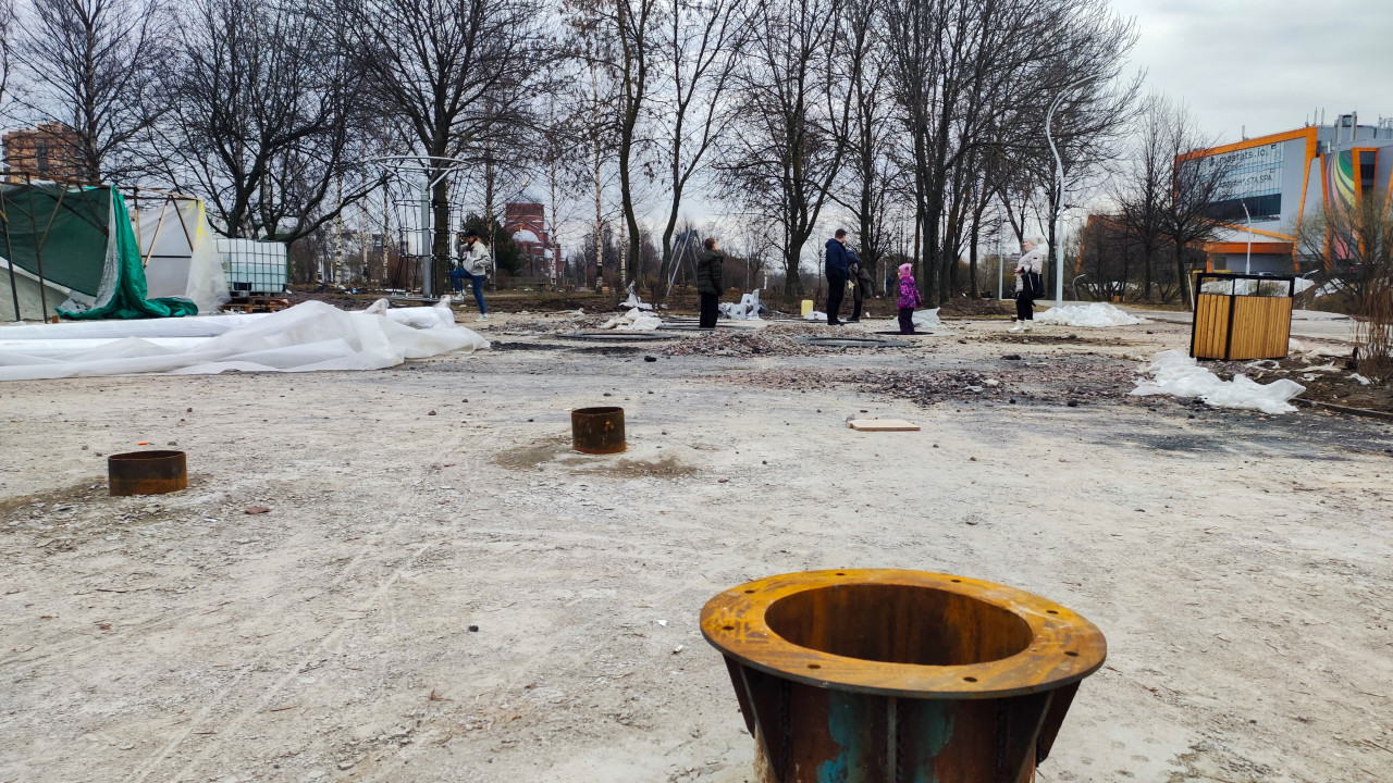 Строительная площадка будущего парка с установленными элементами