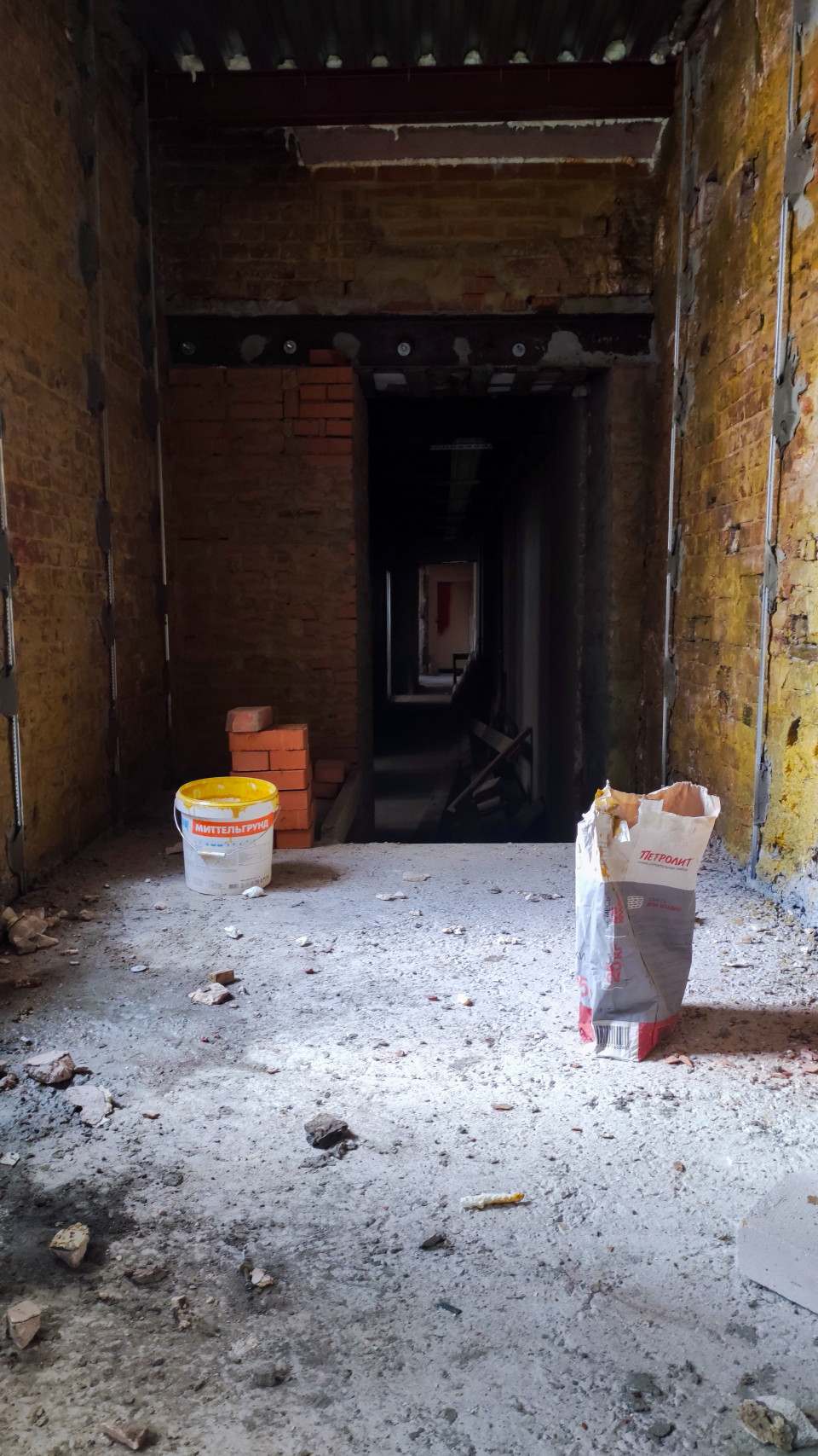 На изображении показан длинный коридор в реконструируемом кирпичном здании. На полу видны остатки строительных материалов, ведро с грунтовкой и мешки с цементом. Стены оголены до кирпича, а потолок укреплён металлическими балками. Сцена иллюстрирует процесс реставрации внутреннего пространства типичного доходного дома Санкт-Петербурга конца XIX – начала XX века. Фото можно использовать для материалов о строительных технологиях и сохранении исторического фонда.