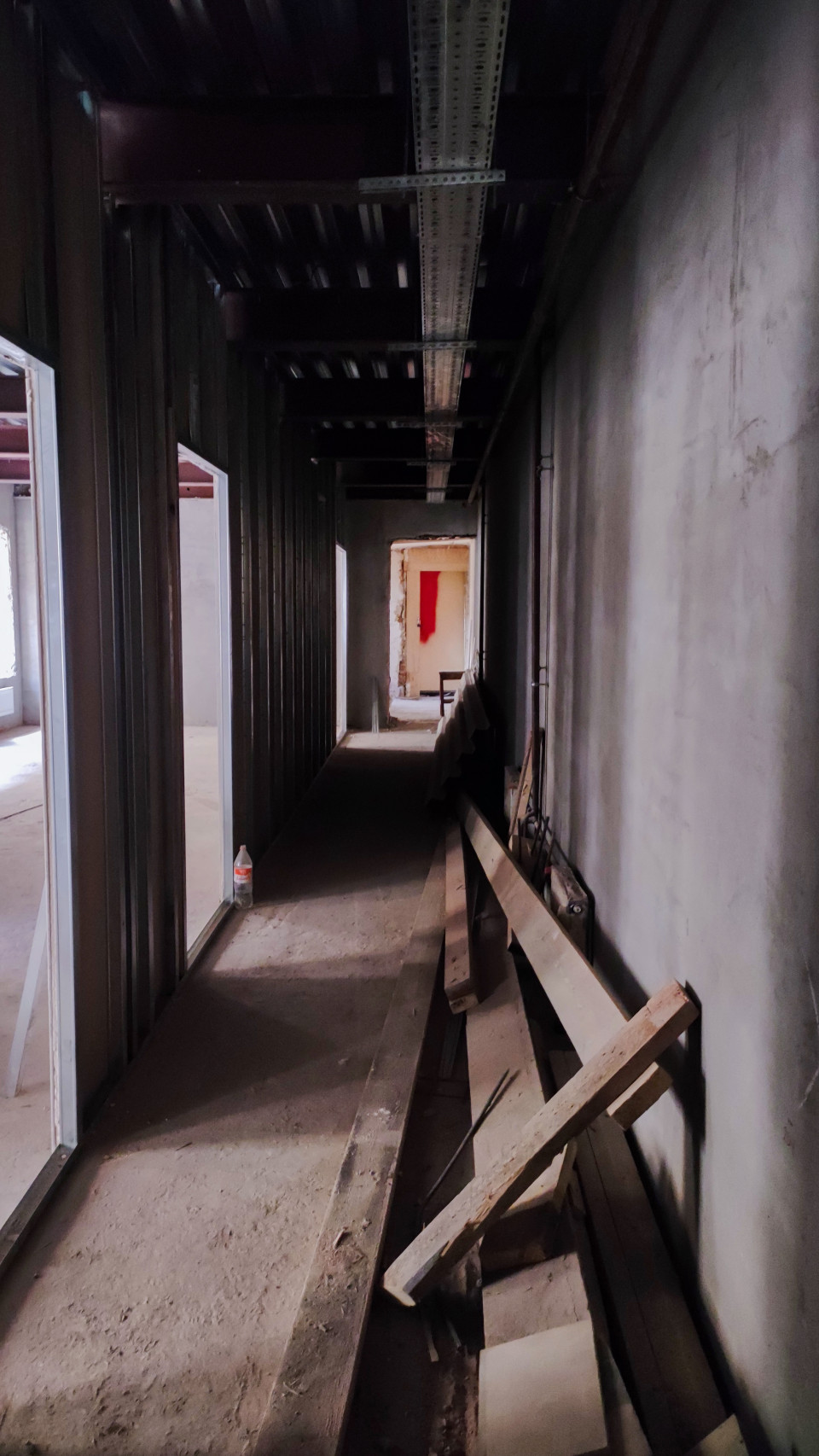На фото изображён коридор в процессе капитального ремонта, с установленными металлическими профилями под перегородки и частично оштукатуренными стенами. На полу лежат деревянные доски и инструменты. Сквозь дверные проёмы виден свет из соседних помещений. Архитектура и структура стен указывают на реконструкцию исторического здания конца XIX века в Санкт-Петербурге. Кадр подходит для иллюстрации строительных процессов и инженерных решений.
