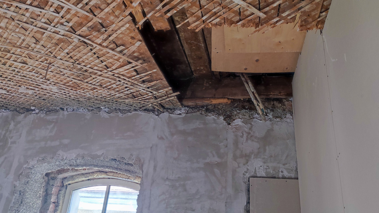 На изображении зафиксирован участок потолка с деревянной дранкой, под которой видны балки перекрытия. Внизу кадра — оштукатуренная стена с арочным окном. Снимок демонстрирует процесс ремонта и укрепления потолочных конструкций в старинном промышленном здании конца XIX – начала XX века. Используется в публикациях о реставрации архитектурного наследия и сохранении деревянных элементов.