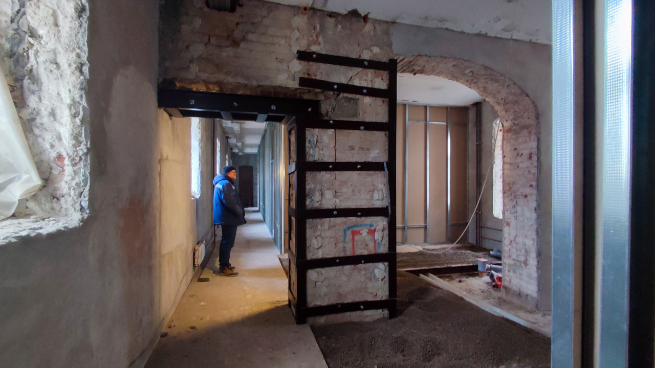 На снимке показан участок коридора с арочными проёмами и кирпичными стенами, где проводится реставрация. Металлические элементы конструкции укрепляют несущие стены. В кадре присутствует человек в спецодежде, осматривающий объект. Фото фиксирует процесс обследования и восстановления исторического здания. Используется в материалах по архитектурной реставрации и строительным технологиям.