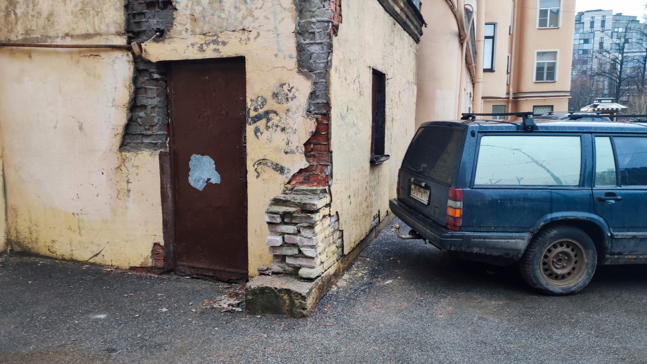 На фото показан фрагмент старого одноэтажного строения во дворе многоквартирного дома. На стене заметны следы разрушений: обнажённая кирпичная кладка, трещины и осыпающаяся штукатурка. У металлической двери стоит старый автомобиль тёмно-синего цвета, припаркованный вплотную к стене. Атмосфера типична для заброшенных или малоиспользуемых дворов в старых районах Санкт-Петербурга. Изображение может быть использовано для демонстрации состояния старого городского фонда и процессов ветшания построек.