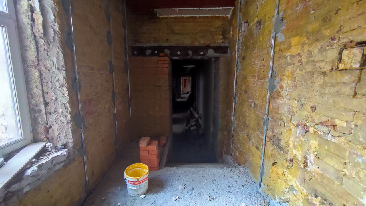 На фотографии изображён коридор старого здания с кирпичными стенами, на которых видны следы реставрации и установки металлических анкеров. На полу находятся строительные материалы — ведро, кирпичи и мешки с цементом. Через проёмы просматривается глубина помещения. Снимок отражает этап восстановления внутреннего пространства архитектурного наследия Санкт-Петербурга и может быть использован в строительной документации и обучающих материалах.