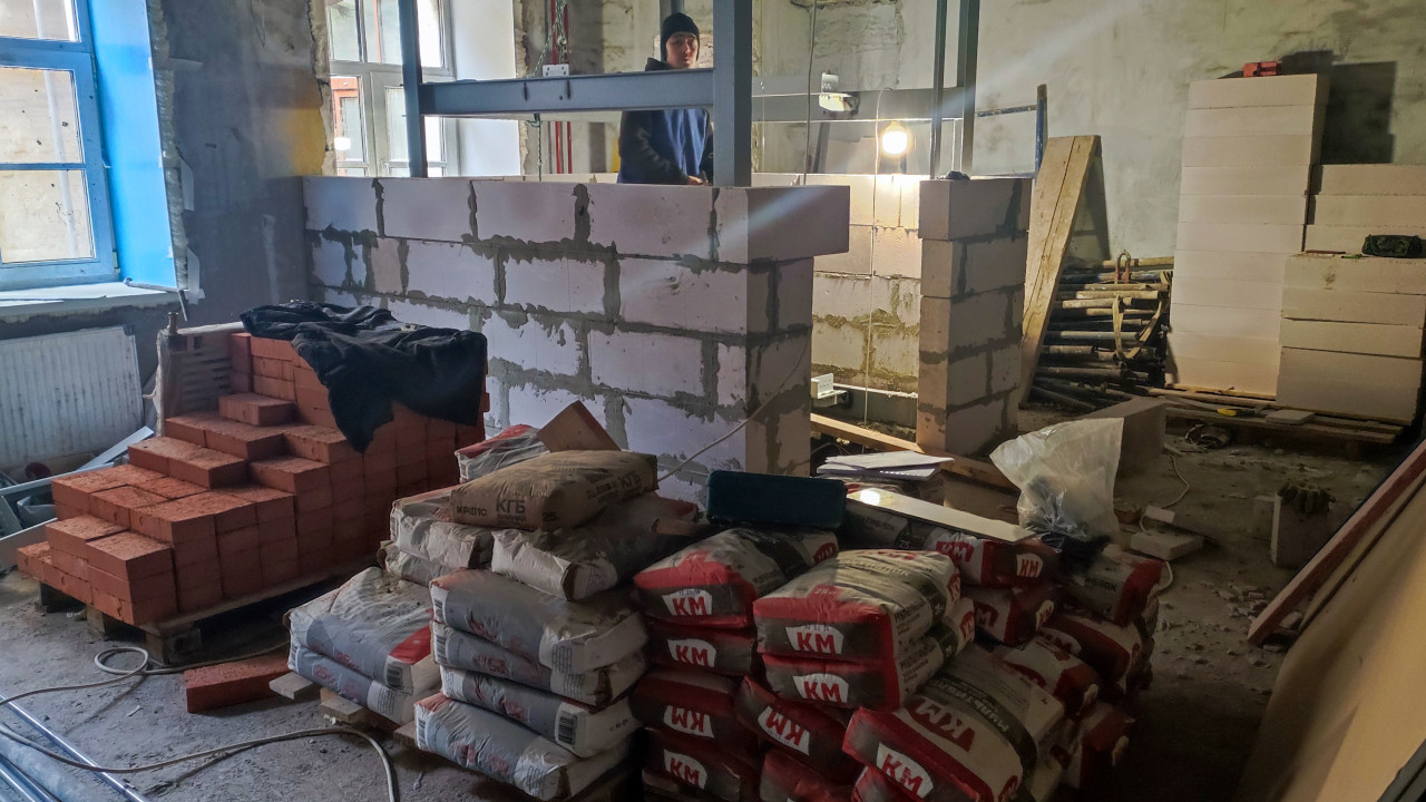 На снимке показано помещение старого здания в процессе ремонта. На переднем плане сложены мешки цемента и стопка красного кирпича, в центре — возводимая стена из газобетонных блоков. Рабочий в тёплой одежде занимается строительными работами при искусственном освещении. Через окно виден дневной свет. Фото иллюстрирует этап внутренней реконструкции исторического здания и может использоваться в контексте строительства и архитектурных проектов.