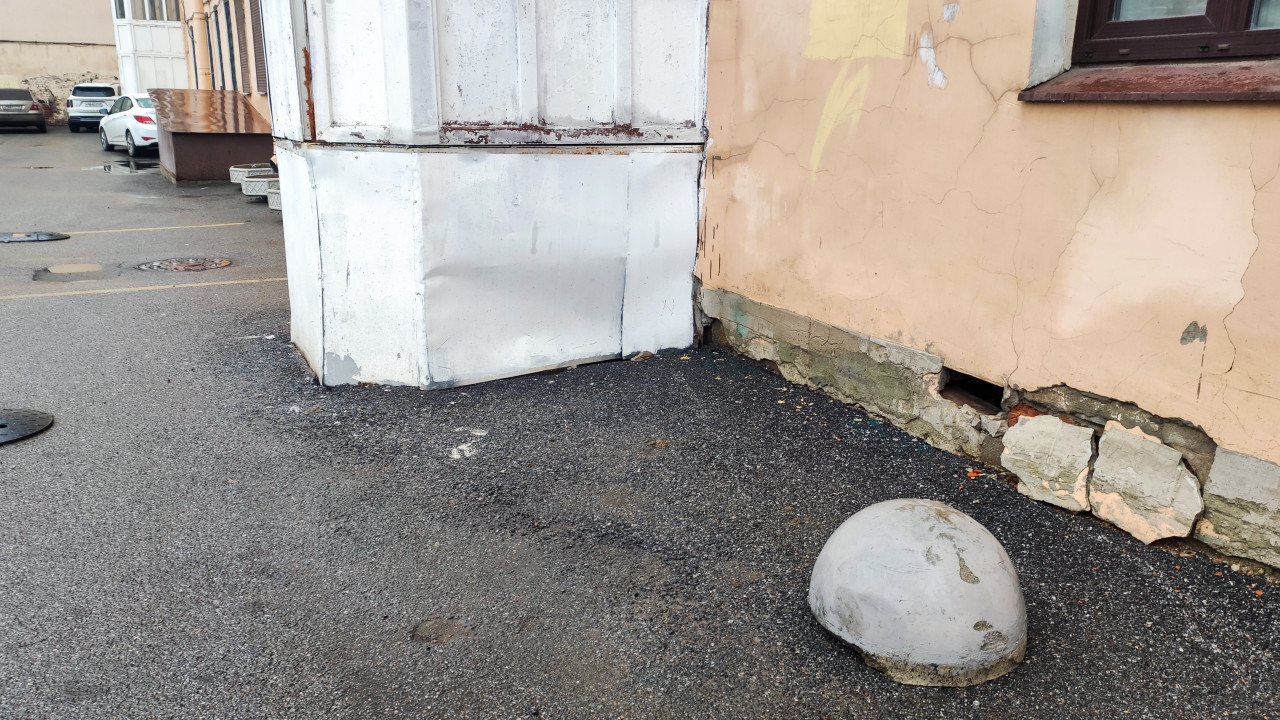 На фотографии изображён фрагмент старого жилого здания с потрескавшейся штукатуркой и повреждённым фундаментом. На асфальте у стены установлен бетонный полусферический ограничитель, препятствующий парковке автомобилей. Снимок сделан во дворе типичной городской застройки начала XX века, в пасмурную погоду, предположительно в Санкт-Петербурге. Изображение можно использовать для иллюстрации тем урбанистики, ветхого жилья, архитектурного упадка и благоустройства дворов.