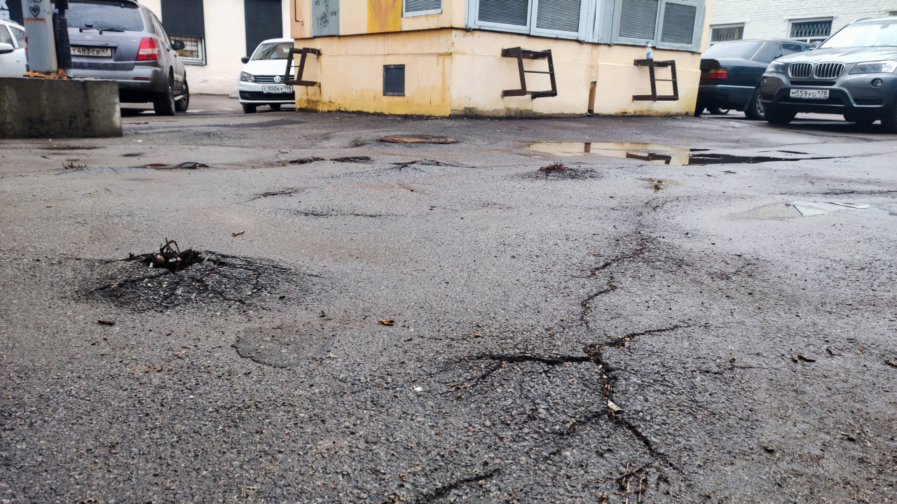 Инженер измеряет глубину вырезки асфальта при обследовании дворовой дороги