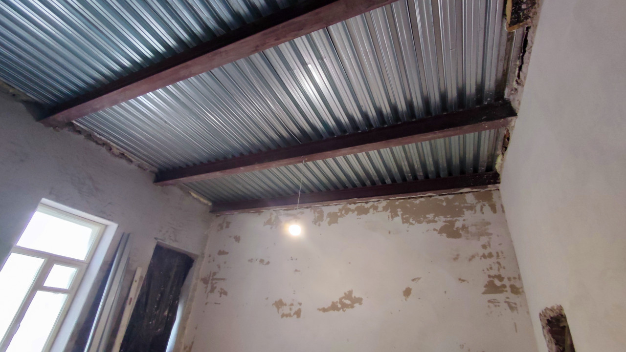 На изображении виден потолок с металлическими балками и профнастилом, установленным в ходе реконструкции здания. Стены частично оштукатурены, виден источник освещения и оконный проём. Фото отражает этап усиления перекрытий и подготовки помещений под дальнейшие отделочные работы. Используется для иллюстрации строительных технологий и инженерных решений при капитальном ремонте старых зданий.