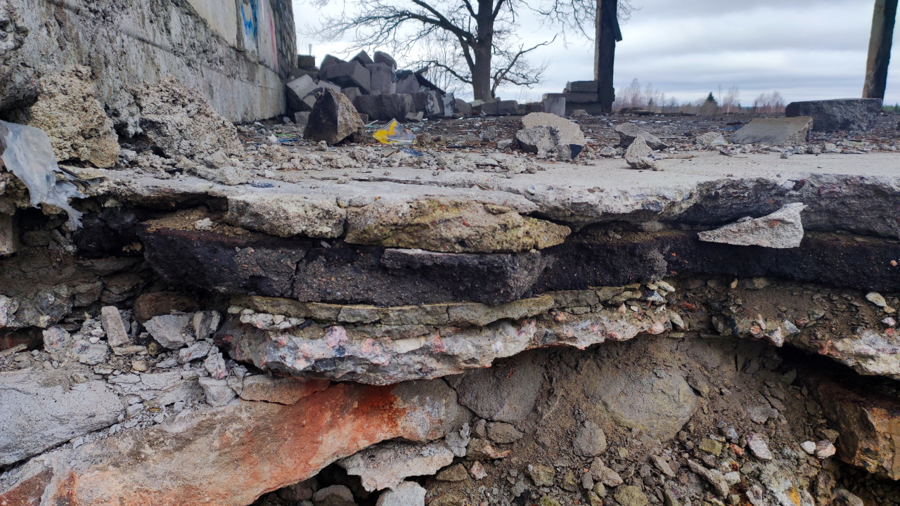 На фото запечатлён крупный план разрушенного бетонного основания, где отчётливо видны слоистые структуры — битум, щебень и армированный бетон. Верхняя часть покрыта мусором и фрагментами стен, на заднем плане виднеются остатки строительных блоков и голые деревья. Снимок выполнен в пасмурную погоду, что подчёркивает фактуру и состояние деградации. Изображение подходит для инженерных отчётов, архитектурных исследований и визуальных материалов об урбанистических руинах.