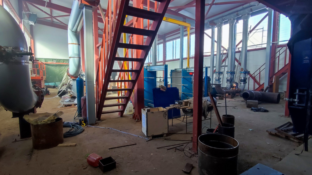 На фото запечатлено внутреннее пространство промышленного цеха с металлическими конструкциями, лестницей и крупными трубопроводами. Видны сварочные аппараты, инструменты, строительные материалы и оборудование. Свет проникает через большие окна, подчеркивая объем помещения. Рабочее пространство предназначено для монтажа технологических систем, вероятно — теплотехнического или энергетического назначения. Снимок подходит для использования в статьях и публикациях о промышленности, инженерных проектах и производственных процессах.