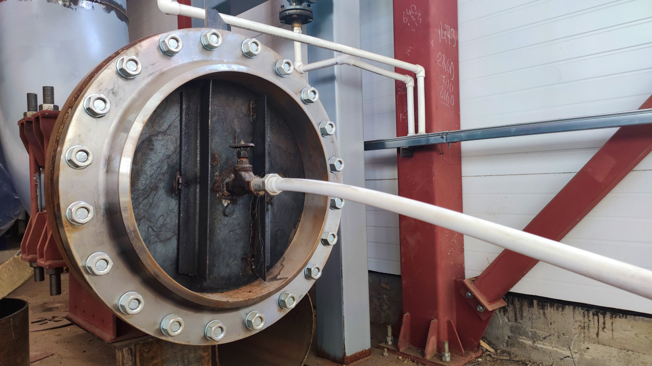 Фотография показывает массивное металлическое фланцевое соединение, к которому подведена белая пластиковая труба. В центре установлен металлический вентиль, соединённый с системой управления. Фон кадра составляют металлические стойки и стеновые панели цеха. Изображение демонстрирует элемент системы подачи или слива технологических жидкостей. Снимок полезен для иллюстрации инженерных и монтажных процессов в промышленной инфраструктуре.