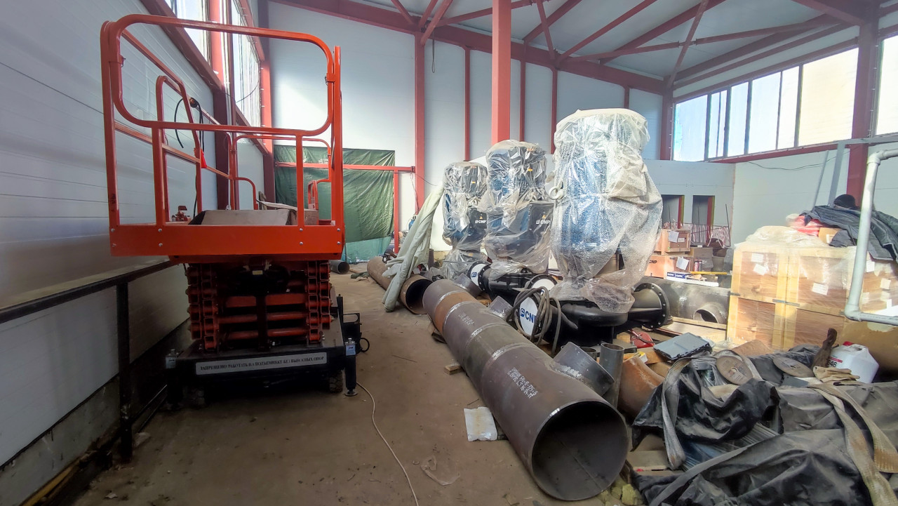 На снимке представлен производственный цех с красной металлической конструкцией и частично собранными трубопроводами. На полу видны секции труб, инструмент, деревянные поддоны и упаковка. Несколько крупных насосов или компрессоров укрыты защитной плёнкой. На переднем плане расположен подъёмник для монтажных работ. Фотография подходит для публикаций, посвящённых промышленному строительству и монтажу инженерных систем.