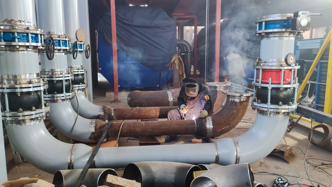 На снимке изображён момент сварки стальных труб крупного диаметра внутри цеха. Рабочий в защитном костюме и маске выполняет сварочные швы на соединении труб. Вокруг расположены элементы будущей трубопроводной системы, а на заднем плане видны металлические опоры и инженерное оборудование. Фотография демонстрирует производственный этап сборки инженерных коммуникаций.