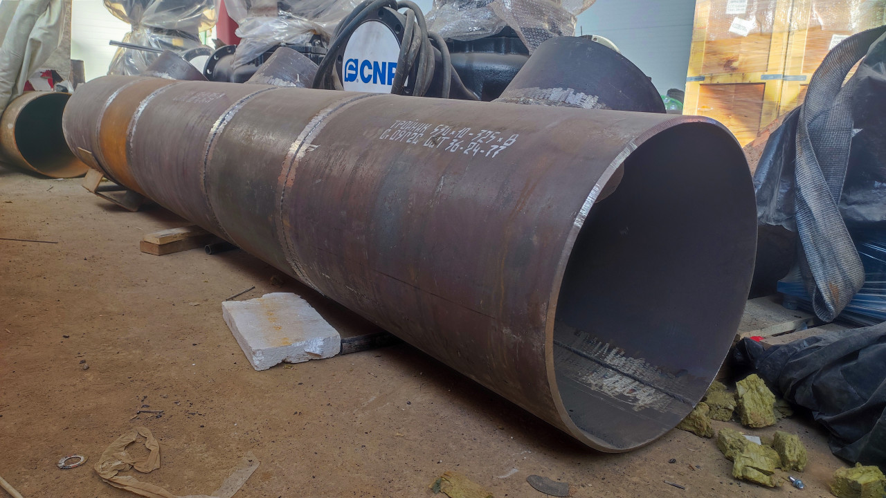 На фотографии изображена крупная металлическая труба с видимыми сварными швами и нанесённой маркировкой белой краской. Изделие лежит на деревянных подставках на полу производственного помещения, вокруг расположены другие трубные заготовки, детали и упаковочные материалы. Снимок сделан при естественном освещении, фиксируя этап хранения или подготовки компонентов трубопроводной системы. Фото может использоваться в инженерных и технических публикациях.