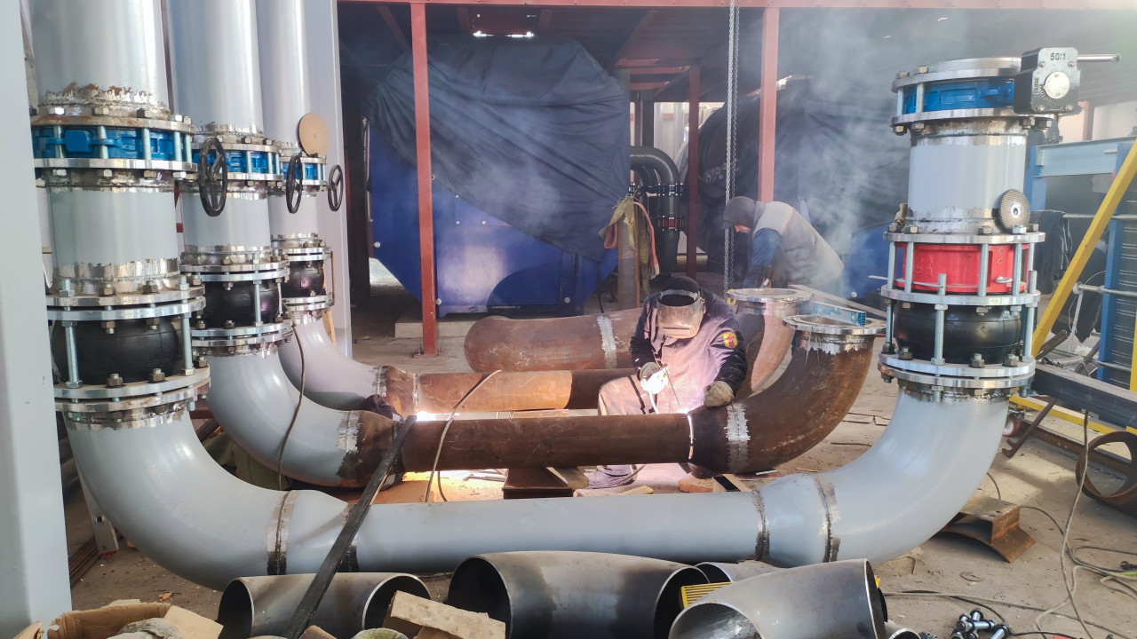 Фотография фиксирует сварочные работы на узле трубопроводной системы. Рабочий выполняет сварку металлических труб, окружённый элементами фланцев, вентилей и отводов. На переднем плане видны серые окрашенные трубы, на заднем — красные балки и оборудование. Сцена снята в промышленном помещении с активной сборкой инженерных систем.