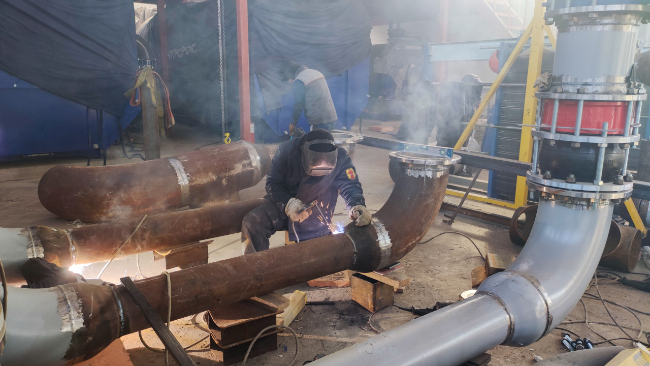 На изображении сварщик выполняет соединение металлических труб большого диаметра с применением ручной дуговой сварки. Вокруг расположены детали будущего трубопровода, сварочное оборудование и инженерные конструкции. В помещении наблюдается характерный дым, свидетельствующий о ходе работ. Фотография отражает производственный процесс монтажа инженерных систем.