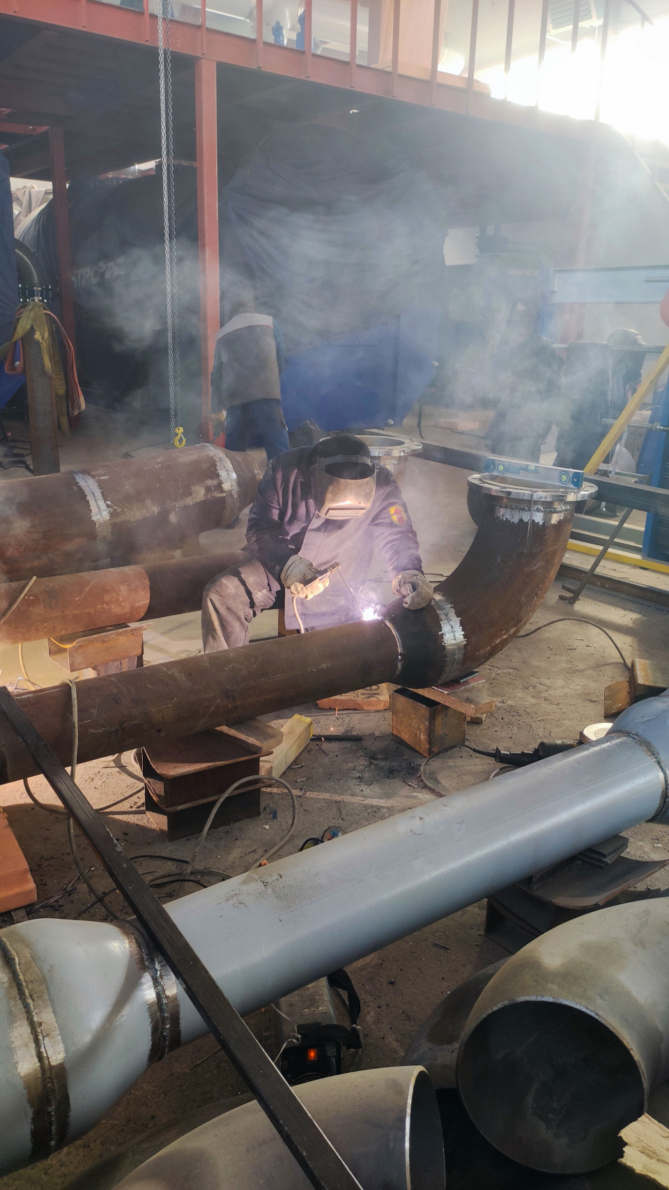 На снимке запечатлён сварщик, выполняющий ручную дуговую сварку стальных труб. Рабочее место оборудовано подставками, заготовками и элементами инженерной системы. В воздухе виден дым от сварки, а фон составляют балки и детали оборудования. Изображение фиксирует процесс соединения трубопроводов в рамках производственного цикла.