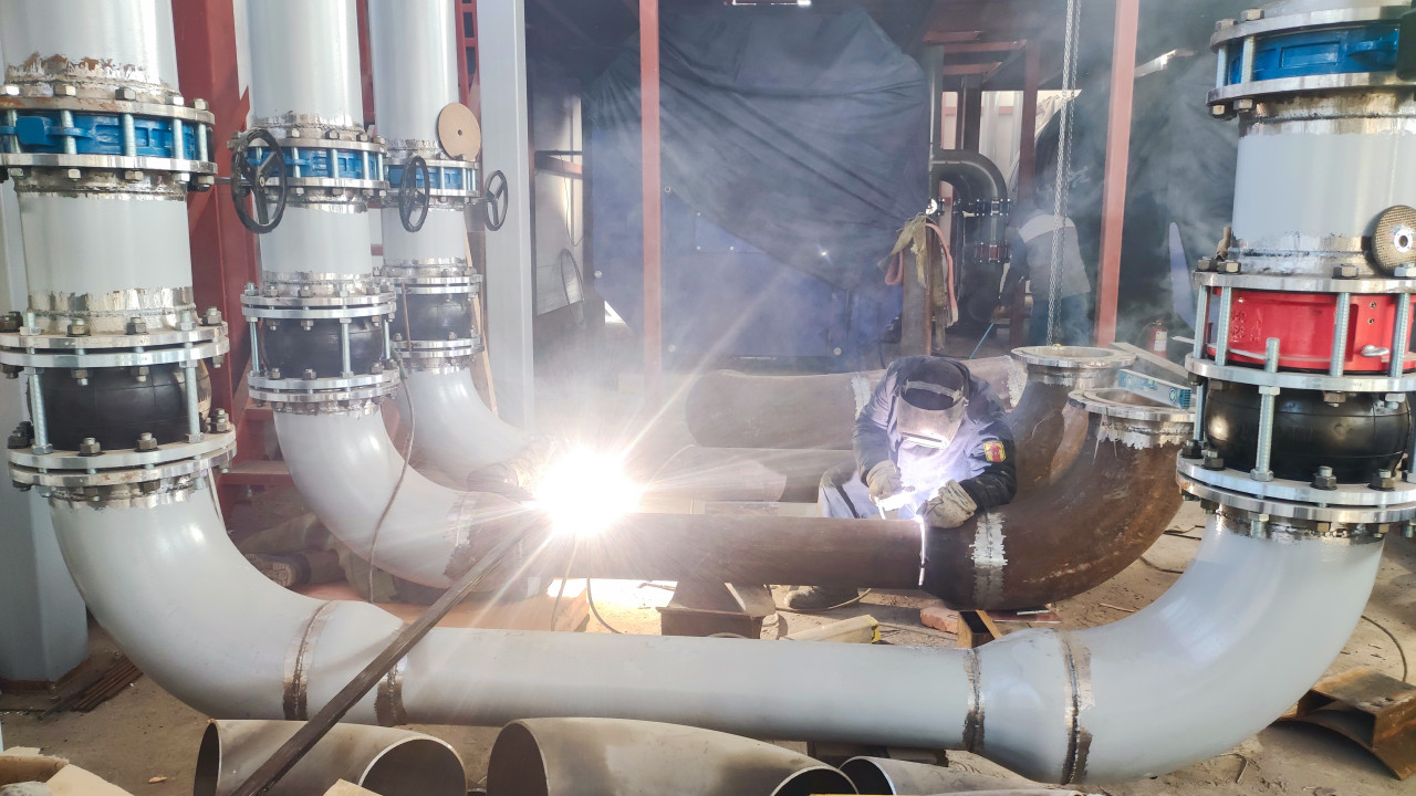 Изображение демонстрирует момент яркой электродуговой сварки при соединении стальных труб. Рабочий в защитной маске и перчатках сосредоточенно выполняет операцию, искры и дым создают характерную атмосферу производственного процесса. Рядом видны крупные трубы, фланцы, запорные элементы и металлические конструкции, типичные для систем отопления или теплообмена. Снимок отражает реальные условия труда в энергетическом или машиностроительном объекте. Фото подходит для использования в инженерных публикациях, отчетах и обучающих материалах.