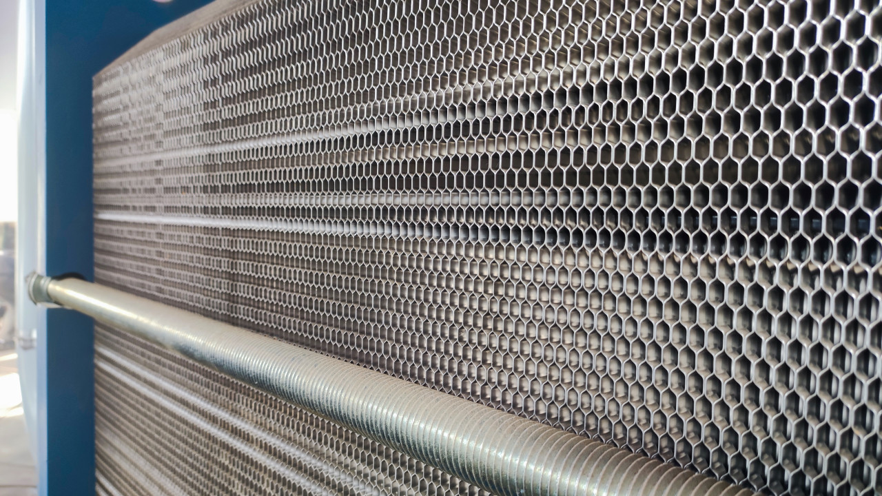Фотография показывает макросъёмку теплообменной поверхности пластинчатого аппарата с сотоподобной структурой. Металлические каналы предназначены для циркуляции горячих и холодных сред, обеспечивая эффективный теплообмен. Конструкция выполнена из нержавеющей стали, устойчивой к коррозии и высоким температурам. Такой тип теплообменников используется в промышленности, энергетике и коммунальных хозяйствах. Фото подходит для технических иллюстраций и обучающих материалов.