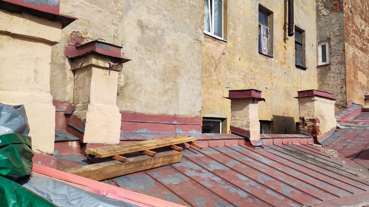 Крыша здания с обвалившейся кирпичной вентиляционной шахтой