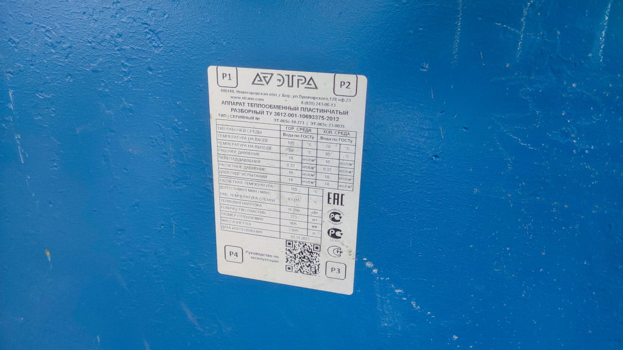 Табличка с техническими характеристиками пластинчатого теплообменника