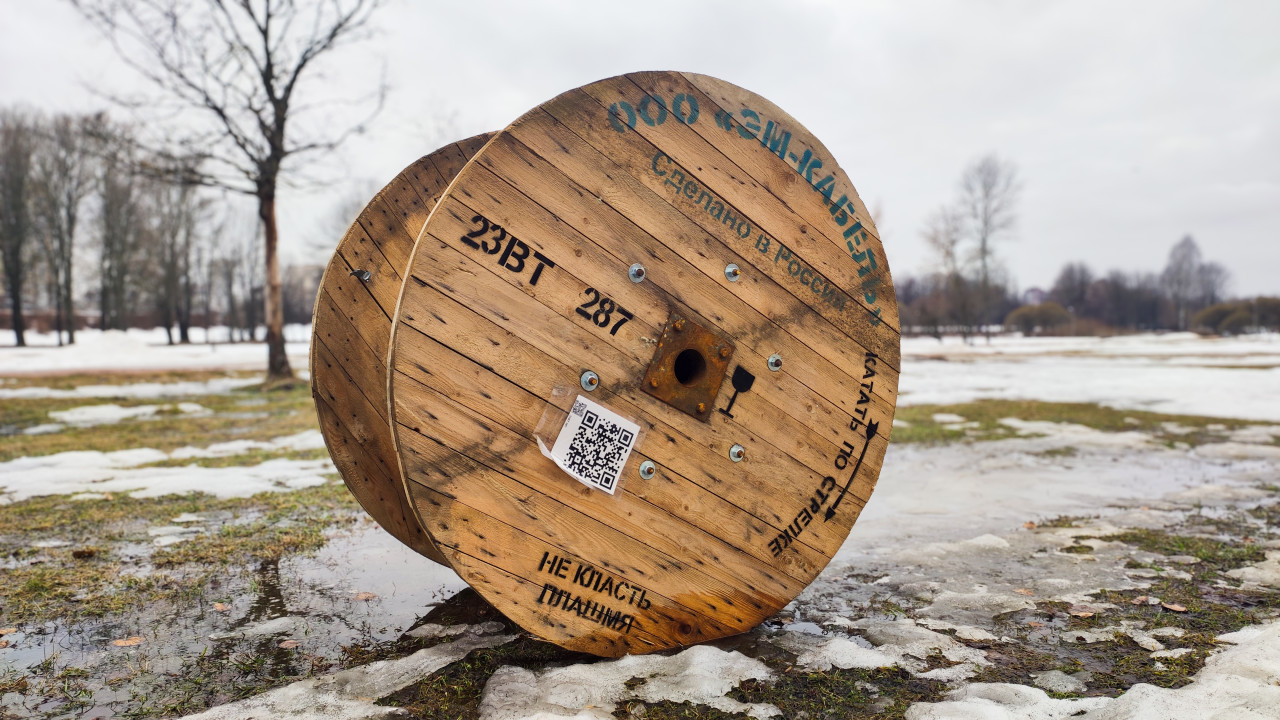 Снимок демонстрирует катушку для кабеля из дерева с надписью «ООО Сибкабель» и QR-кодом. Поверхность барабана содержит указания по транспортировке — стрелка направления и обозначения по стандарту ГОСТ. Объект установлен на влажной почве с остатками снега, вокруг парк с голыми деревьями. Фотография фиксирует элемент строительной инфраструктуры и подходит для использования в тематике инженерных коммуникаций и промышленной логистики.