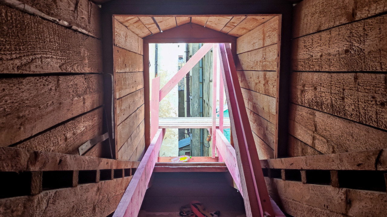 Коридор старого здания на стадии реконструкции с частично разобранной кровлей