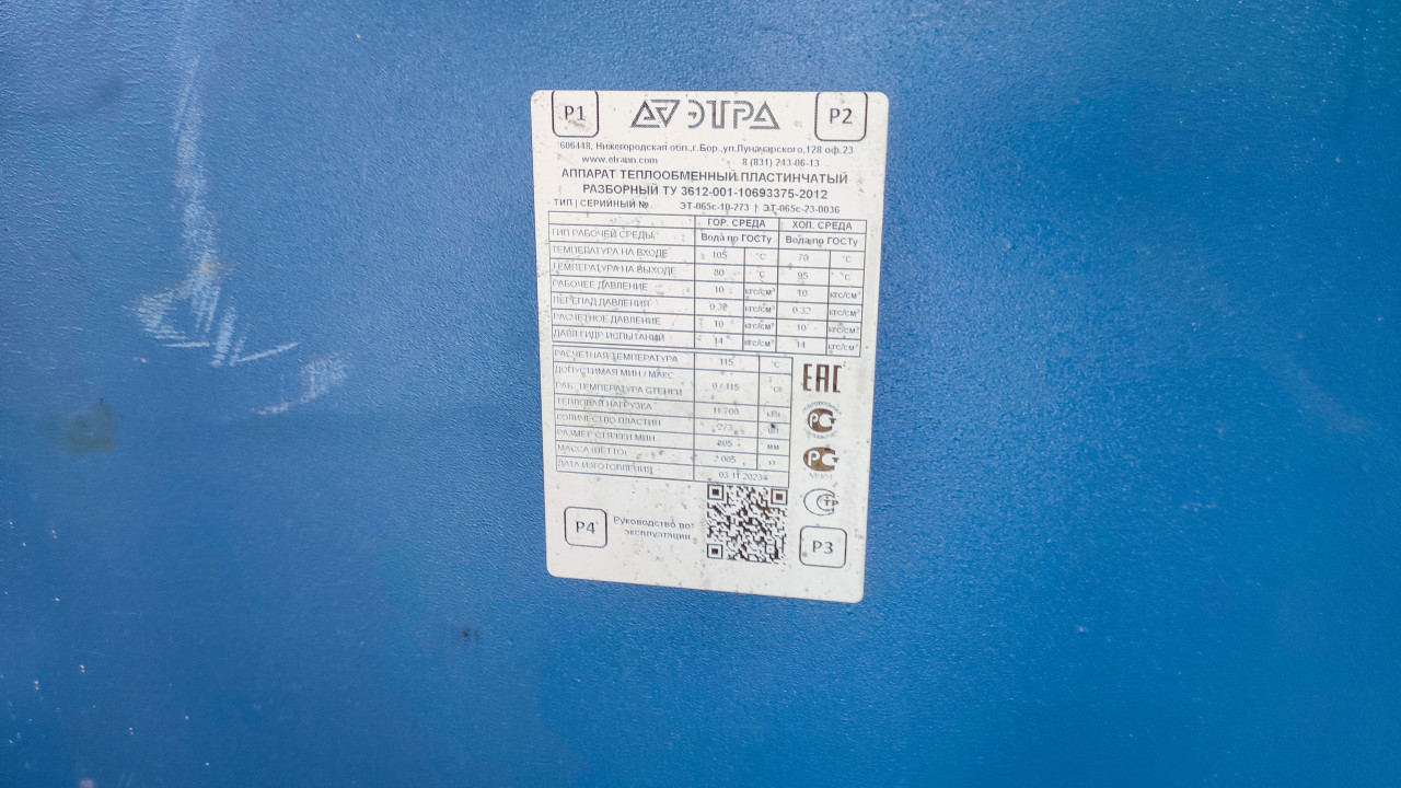 Снимок показывает крупный план информационной таблички на корпусе теплообменника марки «Эгтра». На табличке указаны технические параметры — температура, давление, нагрузка и дата производства. Табличка закреплена на синем металлическом корпусе. Фото иллюстрирует промышленную сертификацию оборудования и может быть использовано в технических публикациях, учебных курсах и инженерной документации.