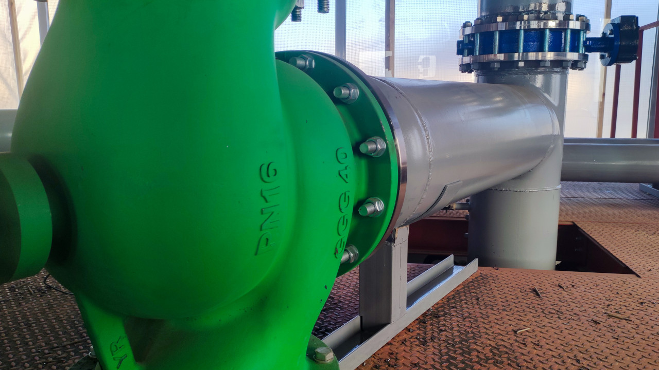 На изображении крупным планом показан фрагмент трубопровода с подключённым зелёным насосом марки PN16. Все элементы смонтированы на металлической платформе с рифлёным настилом. Снимок сделан в котельной в ходе монтажа теплотехнического оборудования. Фото подходит для технических публикаций, инженерных проектов и обучающих материалов по устройству систем отопления и водоснабжения.