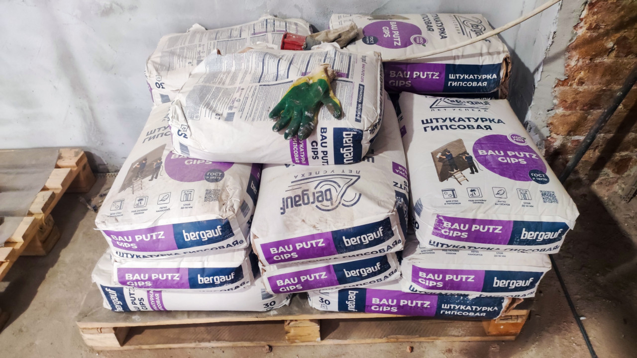 Фотография изображает стопку мешков гипсовой штукатурки Bergauf Bau Putz Gips, уложенных на деревянный поддон в помещении с кирпичной стеной и оштукатуренной поверхностью. На материалах видна маркировка производителя, логотип и технические характеристики. Поверх мешков лежат рабочие перчатки, указывающие на ведение отделочных работ. Сцена снята в помещении исторического здания, проходящего ремонт и внутреннюю реставрацию. Изображение подходит для статей о строительных материалах, реконструкции и реставрации архитектуры.