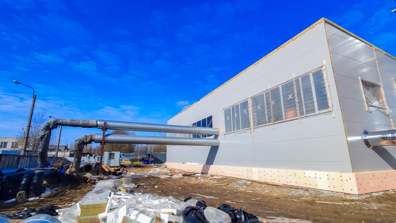 На фотографии показано новое здание модульной котельной с выводом теплотрассы через стену. Видны изолированные трубы, металлические конструкции и участок стройплощадки с остатками строительных материалов. Фото снято при дневном свете, на фоне — голубое небо. Используется для демонстрации энергетической инфраструктуры.