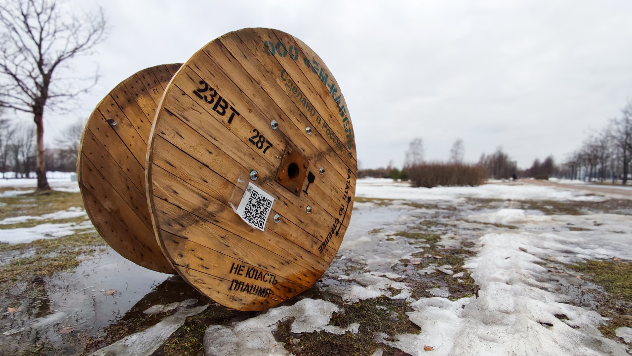 На снимке показан деревянный барабан с кабелем, стоящий на покрытой снегом и льдом земле. На поверхности барабана видна маркировка «Сибкабель», стрелка и надписи по стандарту обращения. Вдали виднеются ряды деревьев и открытое пространство парка. Фото демонстрирует элемент инженерной инфраструктуры в процессе транспортировки и может быть использовано в статьях о промышленности и энергетике.