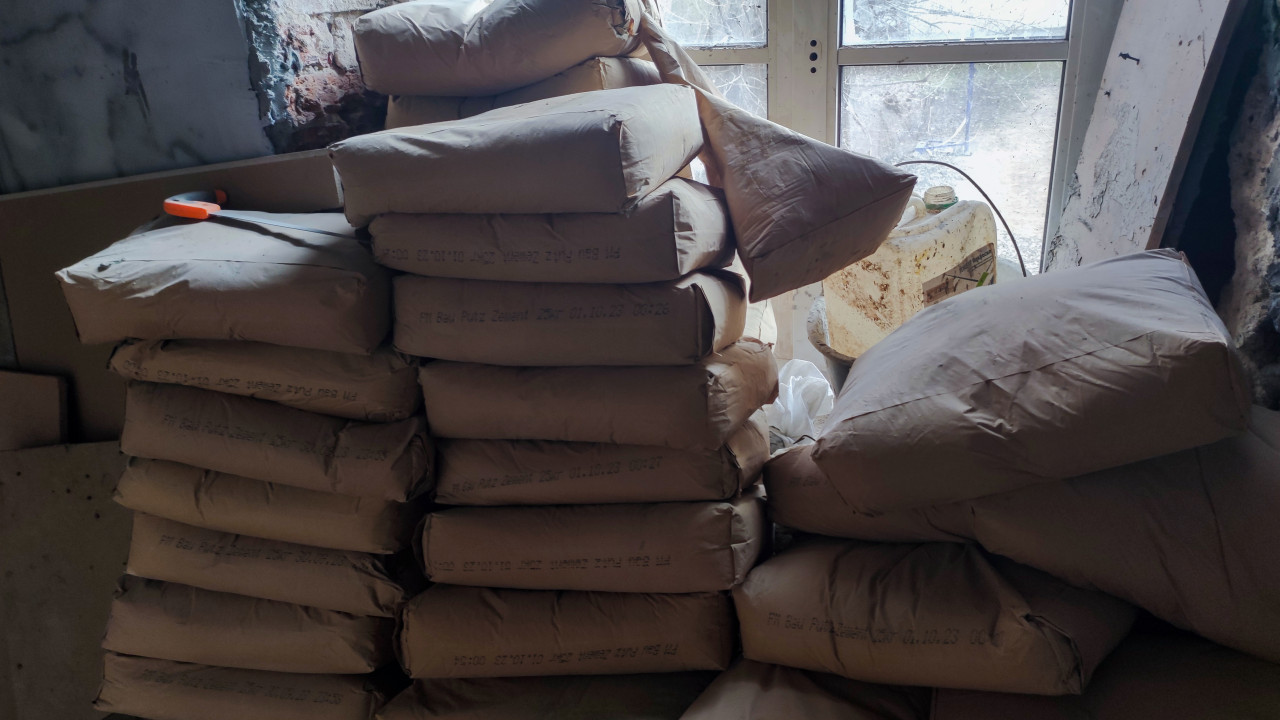 На фотографии изображена стопка бумажных мешков с цементом, аккуратно сложенных у окна. На упаковке видна маркировка “PM Bau Putz Zement 25kg”. Освещение естественное, через старое окно промышленного здания. Кадр отражает подготовительный этап строительных работ и может использоваться для иллюстрации складирования и логистики на стройке.