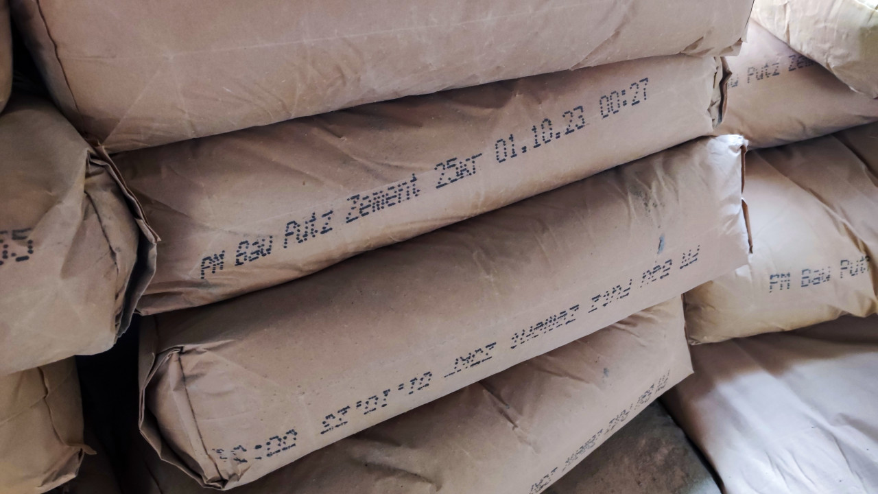 Снимок фокусируется на крупном плане цементных мешков, где отчётливо видна надпись “PM Bau Putz Zement 25kg 01.10.23”. Фото демонстрирует промышленную упаковку строительных материалов, пригодных для штукатурных и отделочных работ. Изображение подходит для иллюстраций в статьях о логистике, поставках и сертификации стройматериалов.
