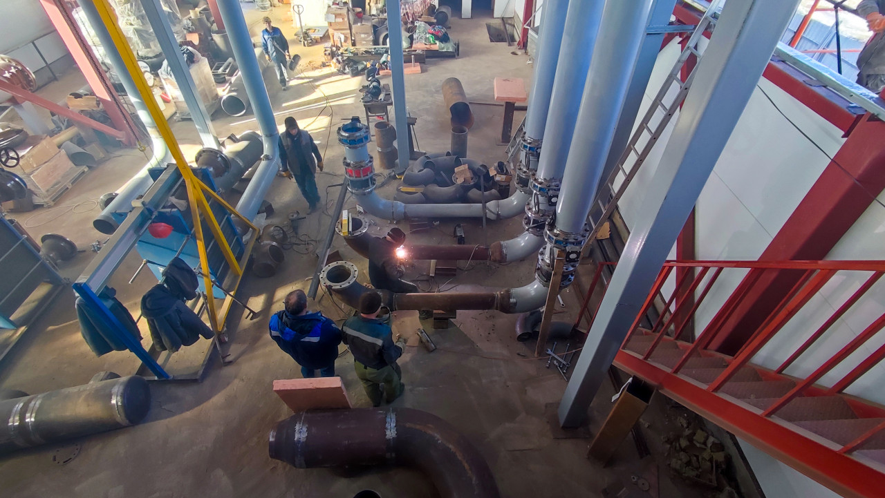 На изображении виден цех котельной, где проводится сварка и сборка стальных трубопроводов. В центре кадра рабочий выполняет сварку с яркой дугой, вокруг расположены детали труб и фланцы. Другие специалисты наблюдают за процессом. В помещении установлены металлические опоры и лестница, на заднем плане видны строительные материалы. Снимок отражает технологический процесс сборки инженерных систем отопления и водоснабжения.
