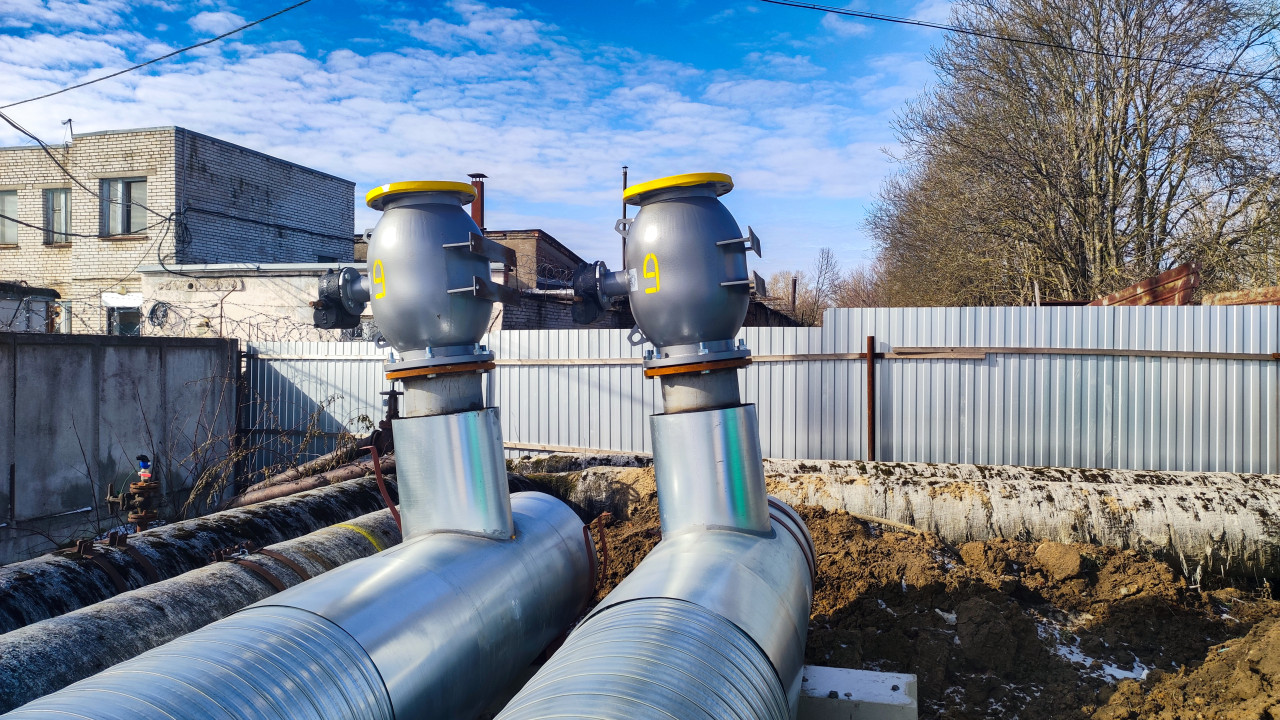 На фото изображены два воздушных клапана, установленных на выходе теплотрассы из котельной. Металлические трубы покрыты теплоизоляцией и защитным кожухом из оцинкованной стали. На заднем плане видны забор и кирпичные здания. Снимок выполнен зимой при солнечном освещении. Фото подходит для статей и отчетов о строительстве и реконструкции систем теплоснабжения.