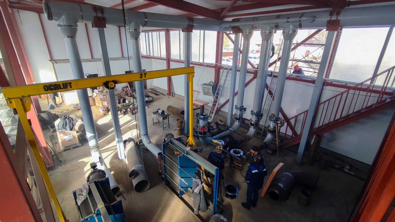 Общий вид котельной с установленными трубопроводами и кран-балкой