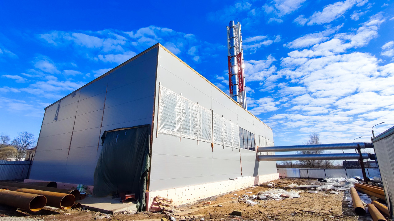 На фотографии изображено новое модульное здание котельной с металлическими стенами из сэндвич-панелей и высокой дымовой трубой из нержавеющей стали. Видны строительные материалы и участок коммуникаций. Снимок сделан на фоне ясного неба. Фото используется для иллюстрации инфраструктурных проектов и энергообъектов.
