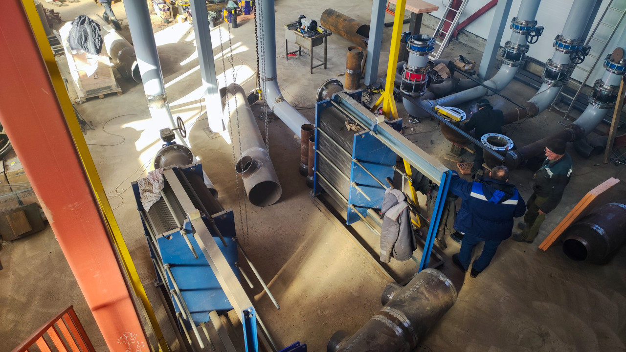Фотография показывает внутреннее пространство котельной на этапе сборки. На полу размещены металлические трубы, фланцы, инструменты и листовые материалы. Вдоль стены установлены вертикальные магистрали и оборудование, слева виден теплообменник. Рабочие выполняют сварку и сборку элементов системы. Снимок подходит для иллюстрации инженерных проектов и технических публикаций.