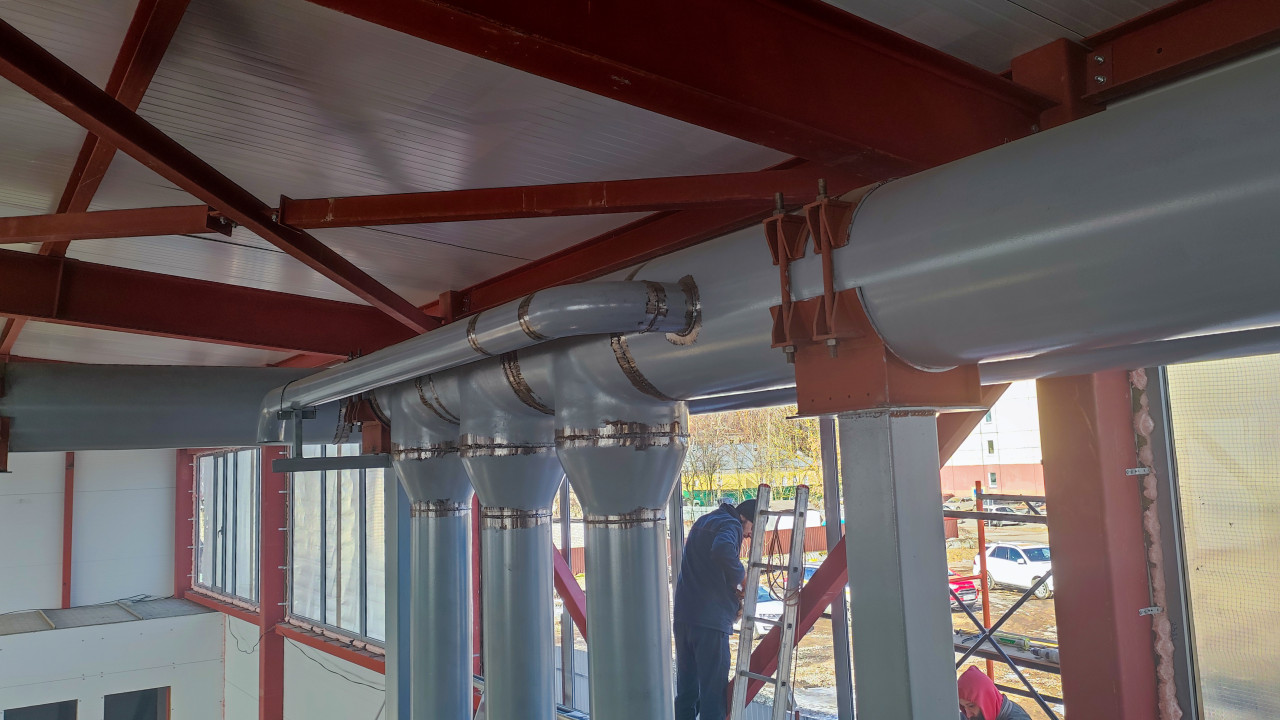 На фото показан монтаж верхней обвязки трубопроводов в котельной. Стальные трубы серого цвета проходят под потолком, закреплённые на красных металлических опорах. Один из монтажников работает на лестнице у окна, за которым виден строительный двор. Фото демонстрирует конструктивное решение по соединению магистральных линий внутри котельного здания.