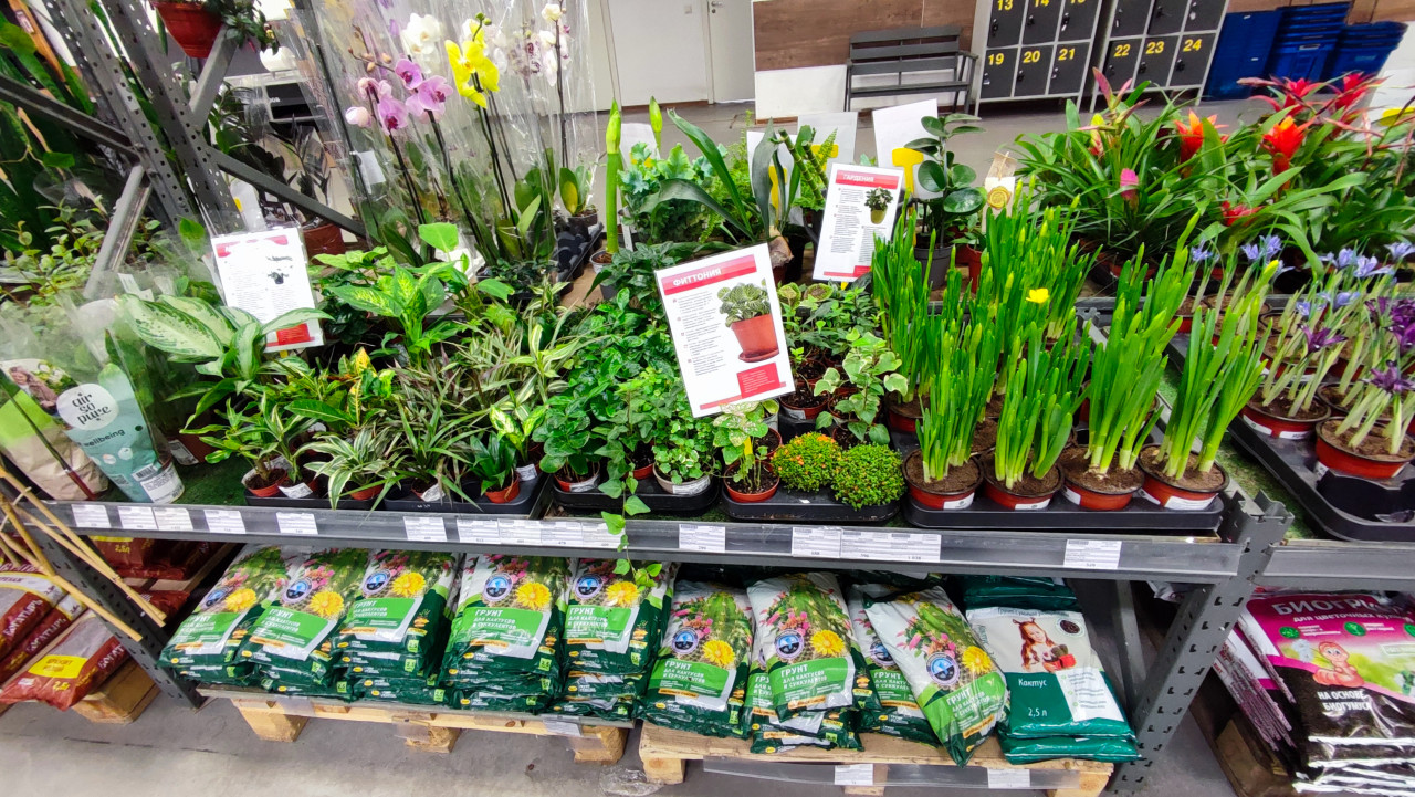 В тележке для покупок находятся товары для садоводства и посадки растений