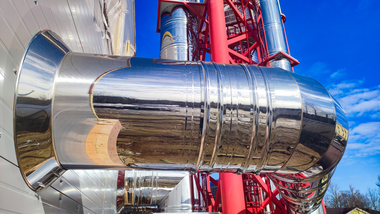 На фото крупным планом изображен блестящий воздуховод из нержавеющей стали, соединяющий здание котельной с вертикальной дымовой трубой. Поверхность отражает окружающую территорию и элементы инфраструктуры. Снимок подходит для использования в технических и архитектурных публикациях.